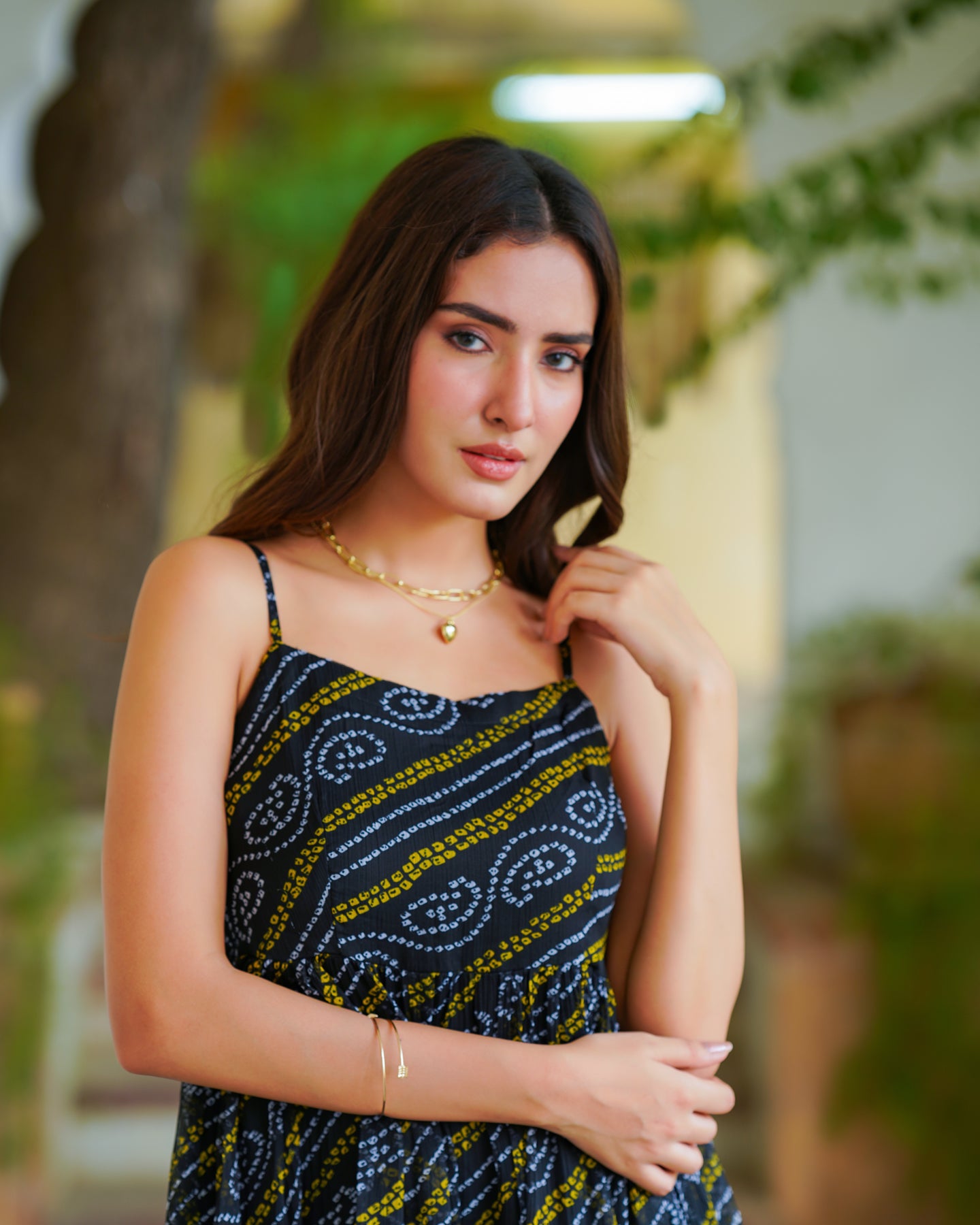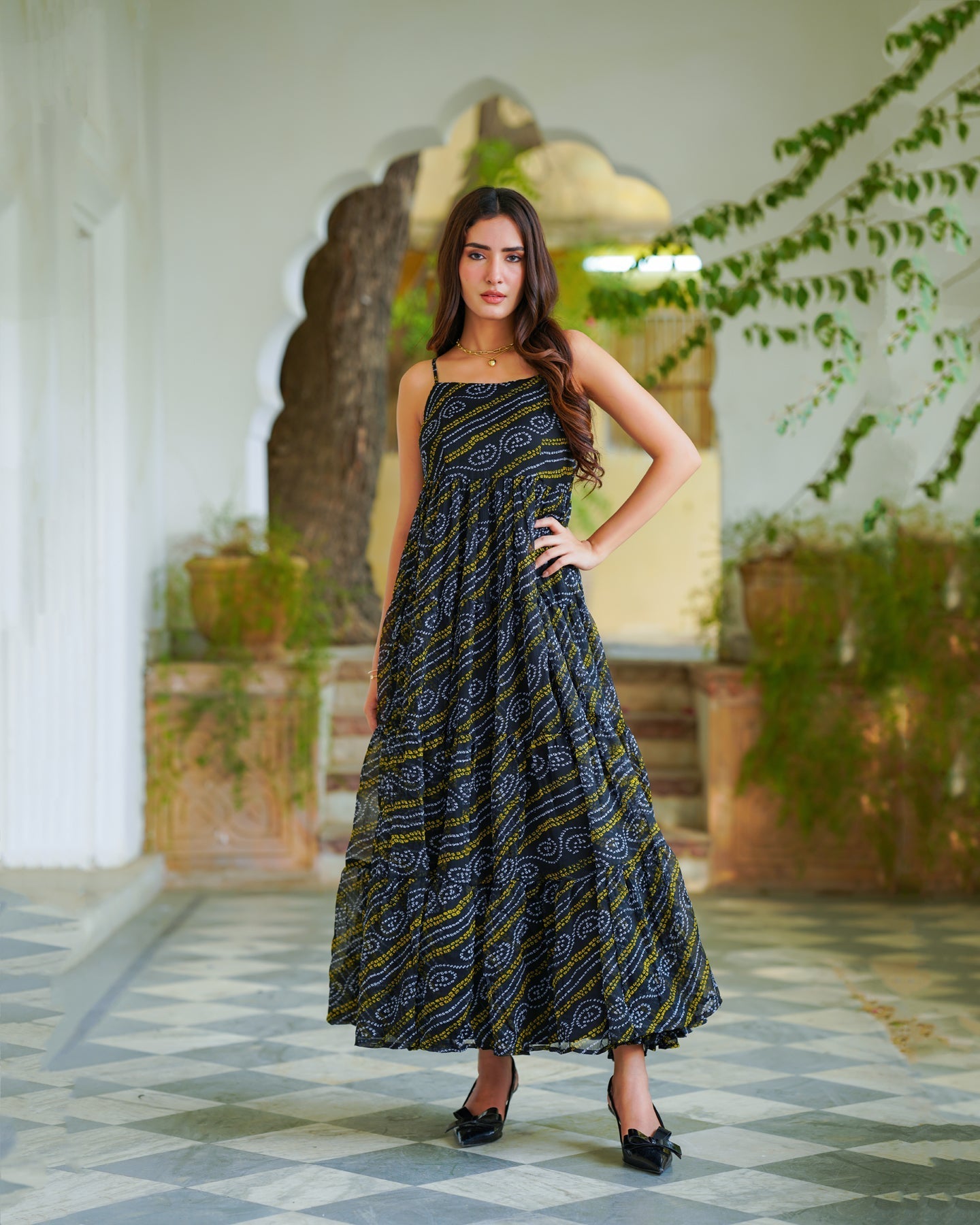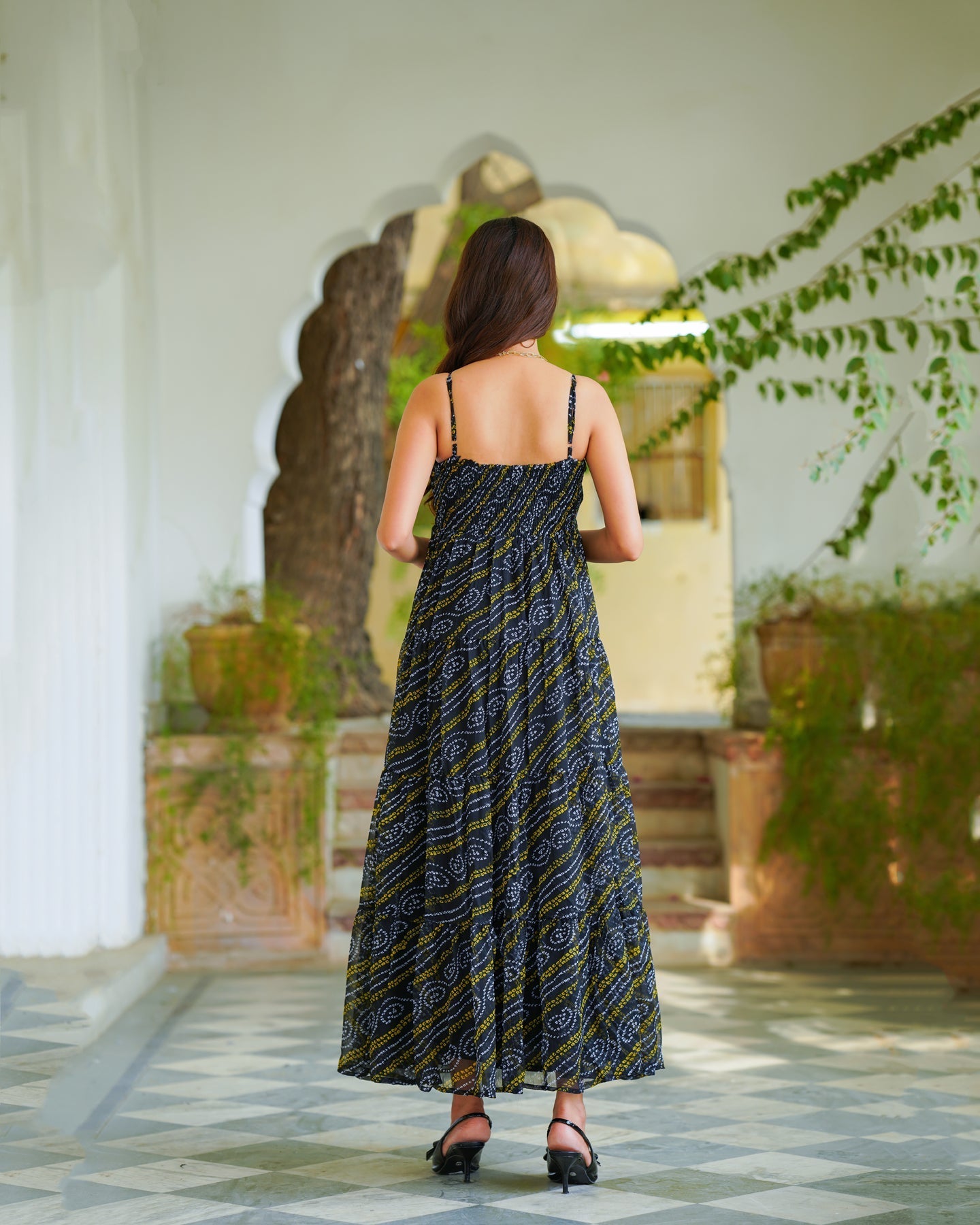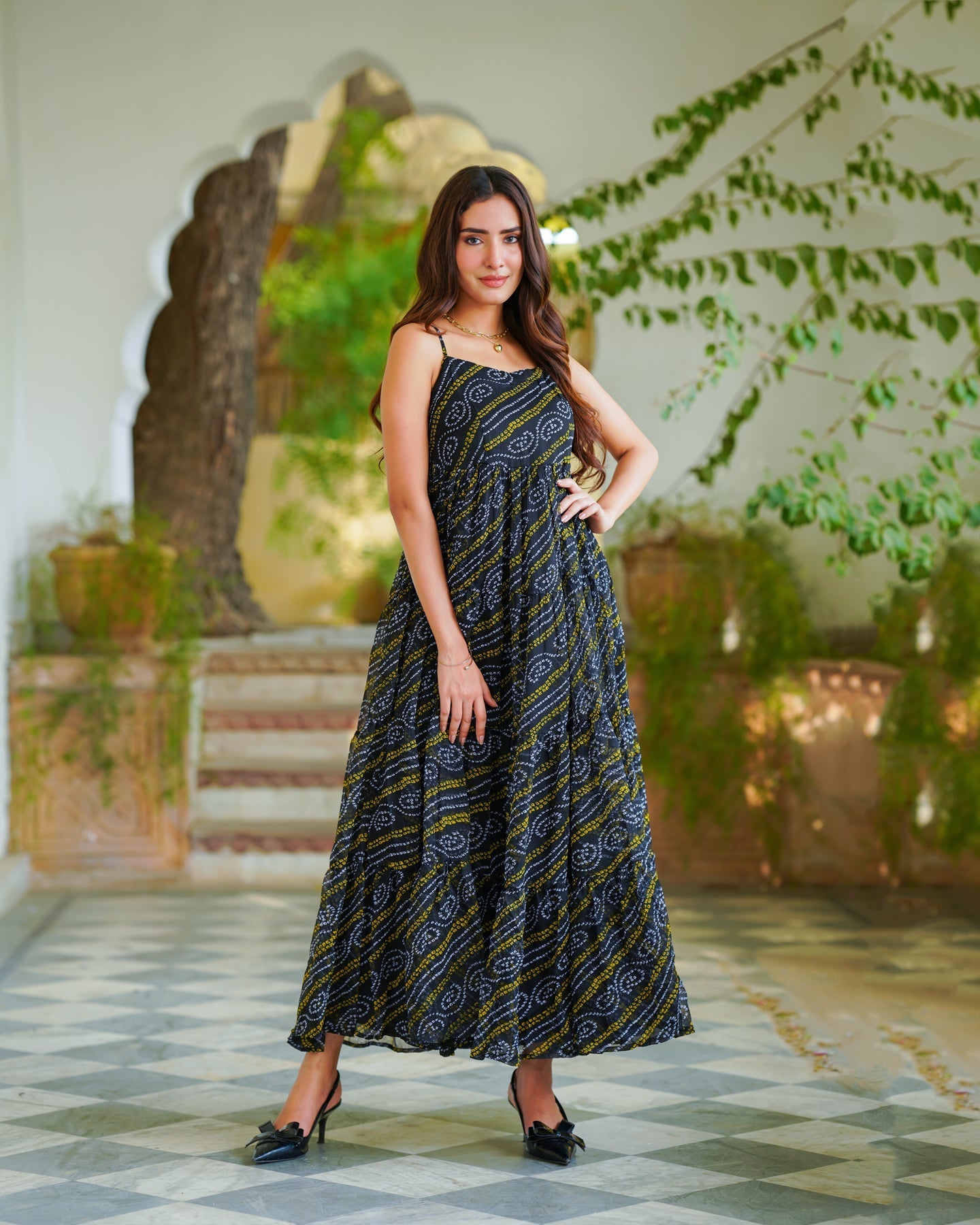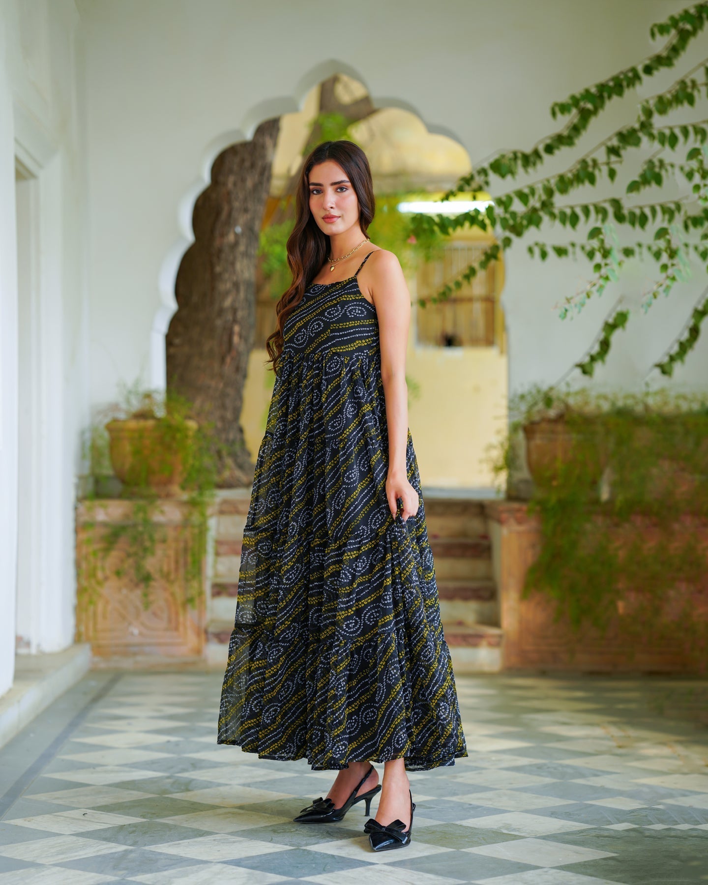 Make a statement with our Bandhej Chiffon Maxi Dress. Featuring a strappy neckline and sleeveless design, this dress combines comfort with style. The tiered pattern and tie-dye prints give it a unique and eye-catching look, perfect for casual outings.