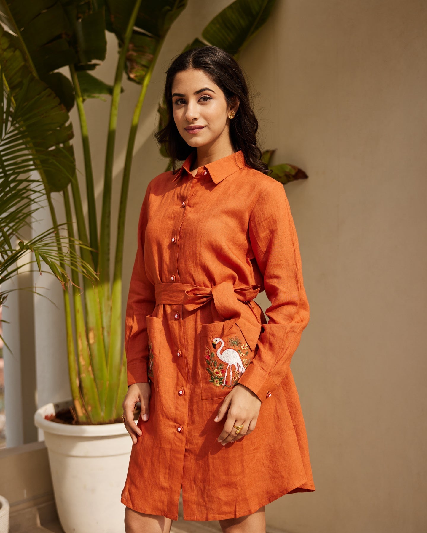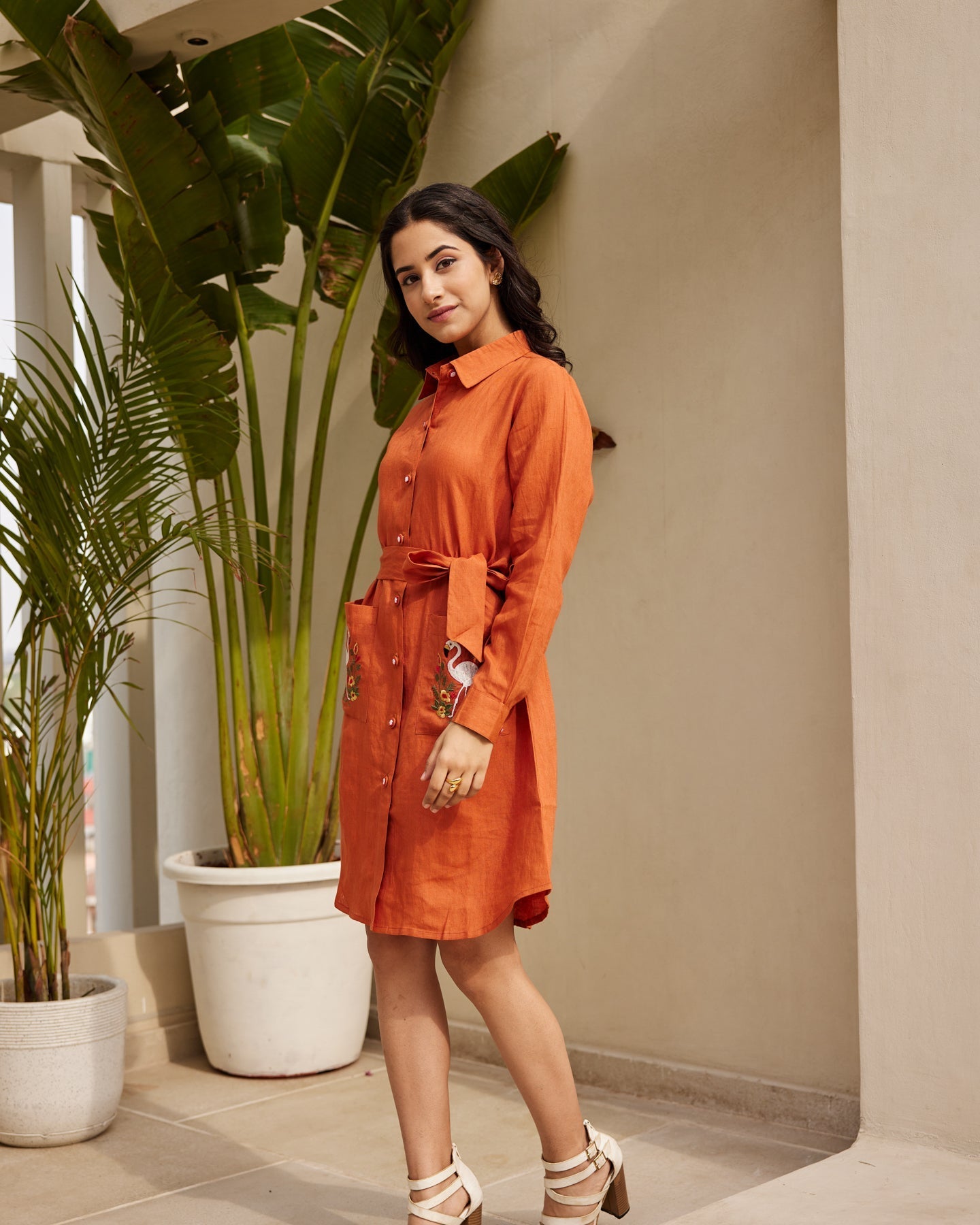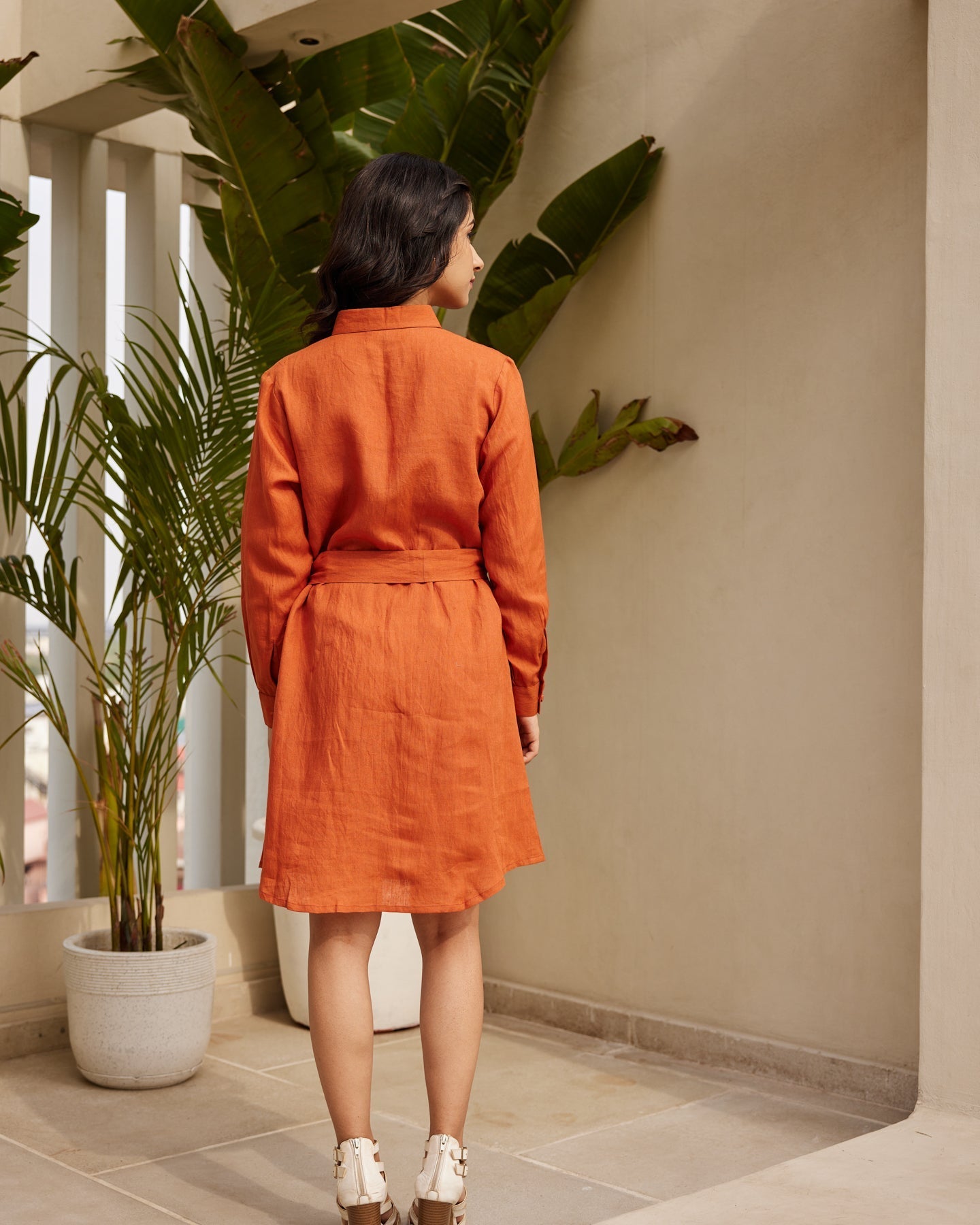 Embrace the freshness of the Basic Orange Linen Dress, featuring a shirt collar and full sleeves. This straight-cut dress is crafted from pure linen, ensuring breathability and comfort. Its vibrant orange hue makes it a standout choice for casual and semi-formal occasions alike.