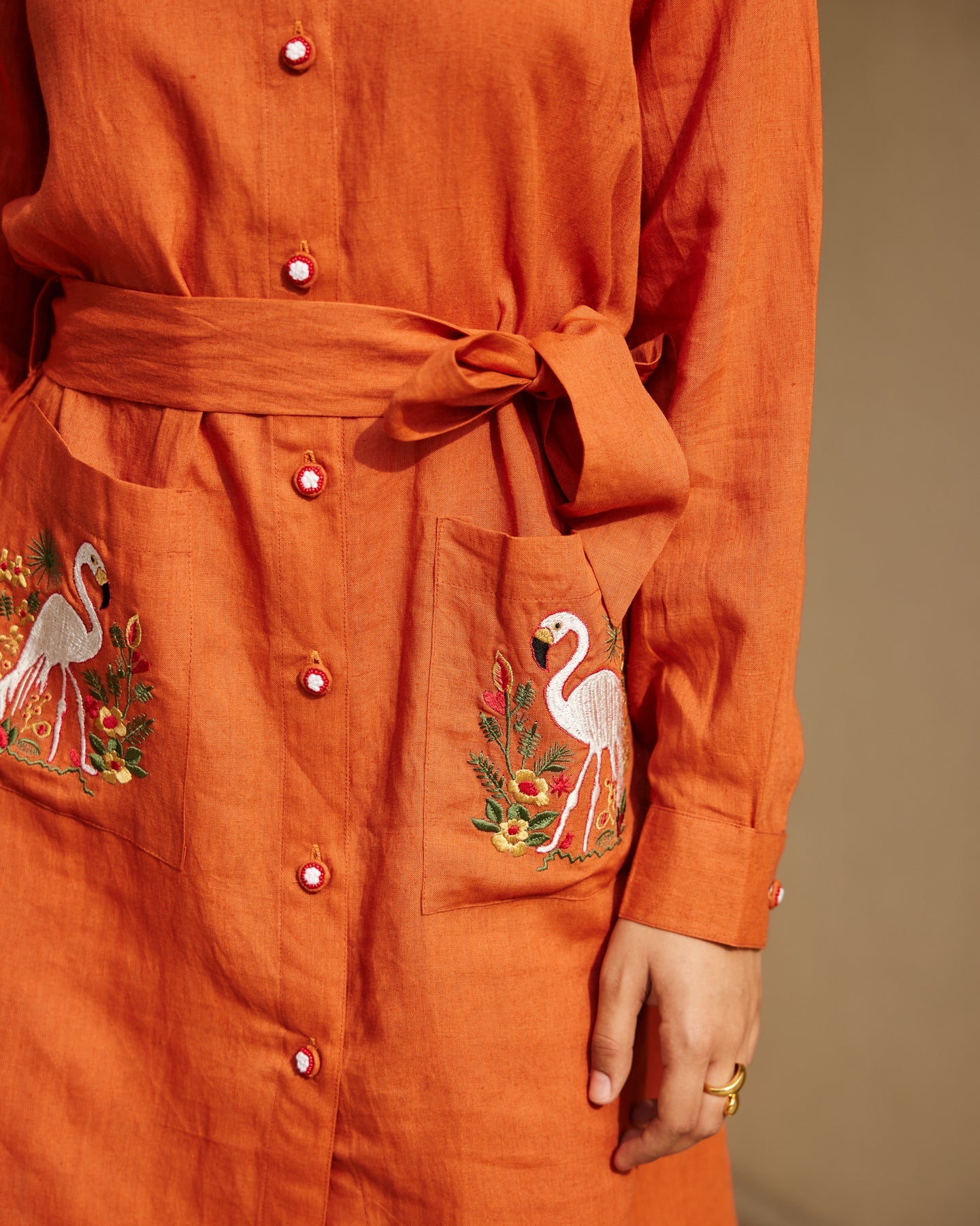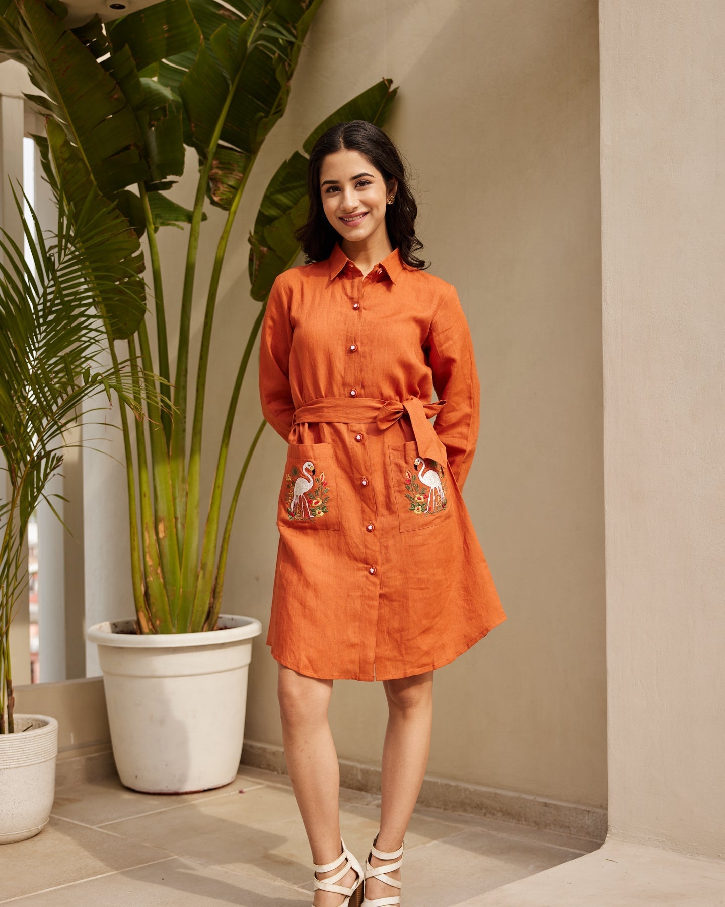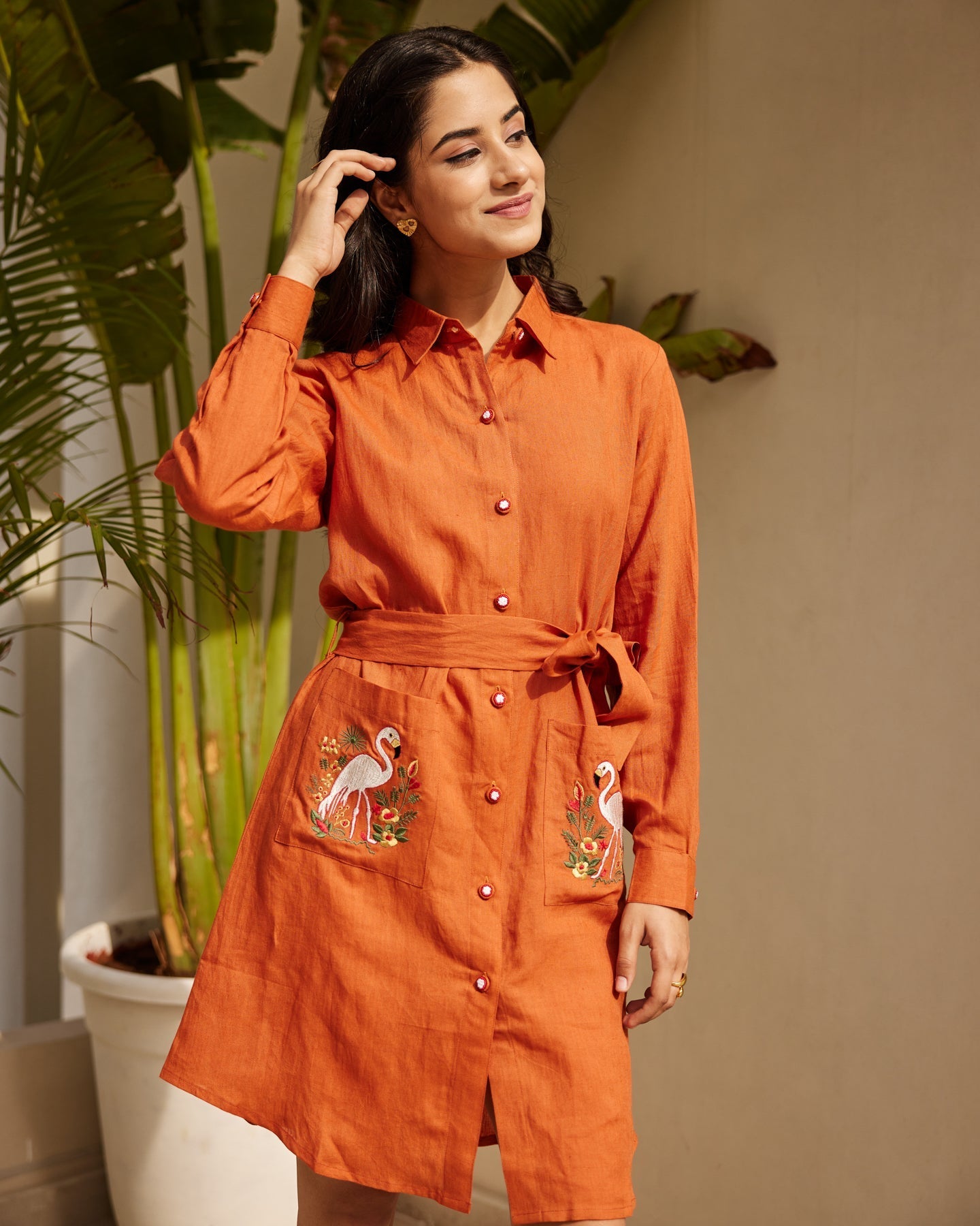 Embrace the freshness of the Basic Orange Linen Dress, featuring a shirt collar and full sleeves. This straight-cut dress is crafted from pure linen, ensuring breathability and comfort. Its vibrant orange hue makes it a standout choice for casual and semi-formal occasions alike.