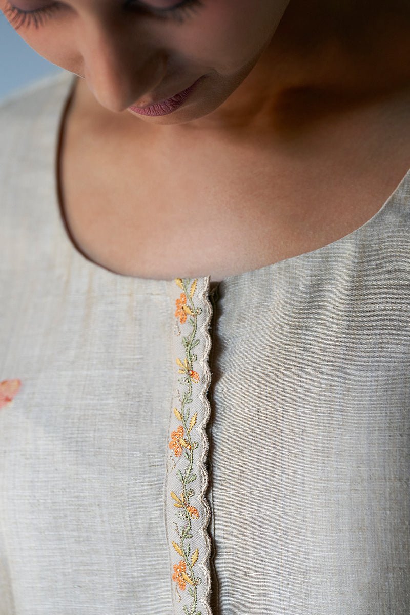 Beige Woven Kurta Suit Set With Delicate Hand Work Detailing and Embroidery Placket