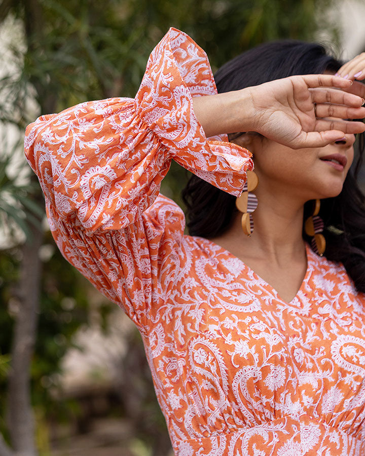 These beautiful block prints can't go out of style, our chloe printed orange colored fully flared maxi is 100% pure cotton based and can never go wrong. You can rock this piece with our buckle belt over it.