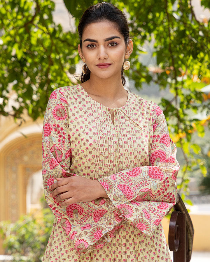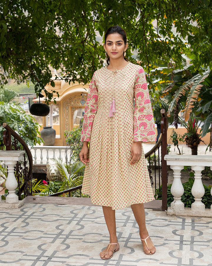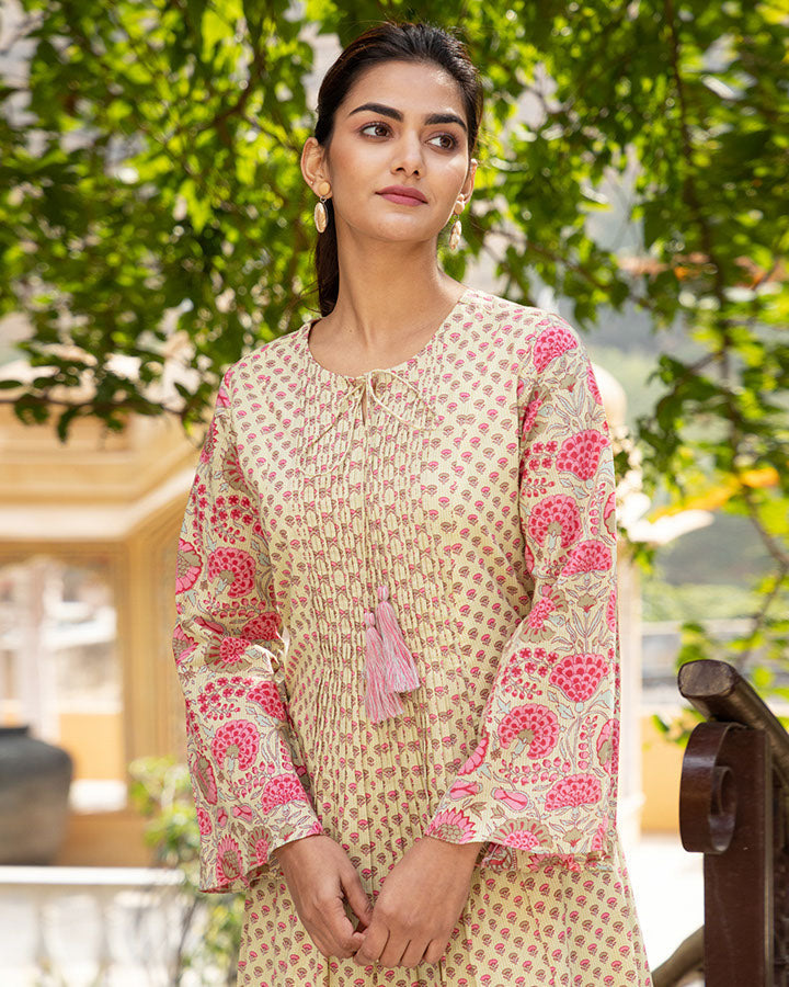 .A chic vibe and an ethnic charm- this dress will give you both! This Corn and Pink Printed Maxi Dress will look great on any occasion. It features pintuck detailing on the bodice, elegant bell sleeves, and Dori tassels on the neckline. Stay true to this classy look by styling it with minimal jewellery or statement earrings.