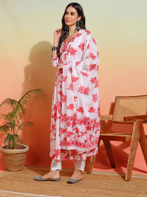 Cotton Floral Printed 3/4th Sleeve V-neck Embroidered Work Anarkali Kurta With Dupatta