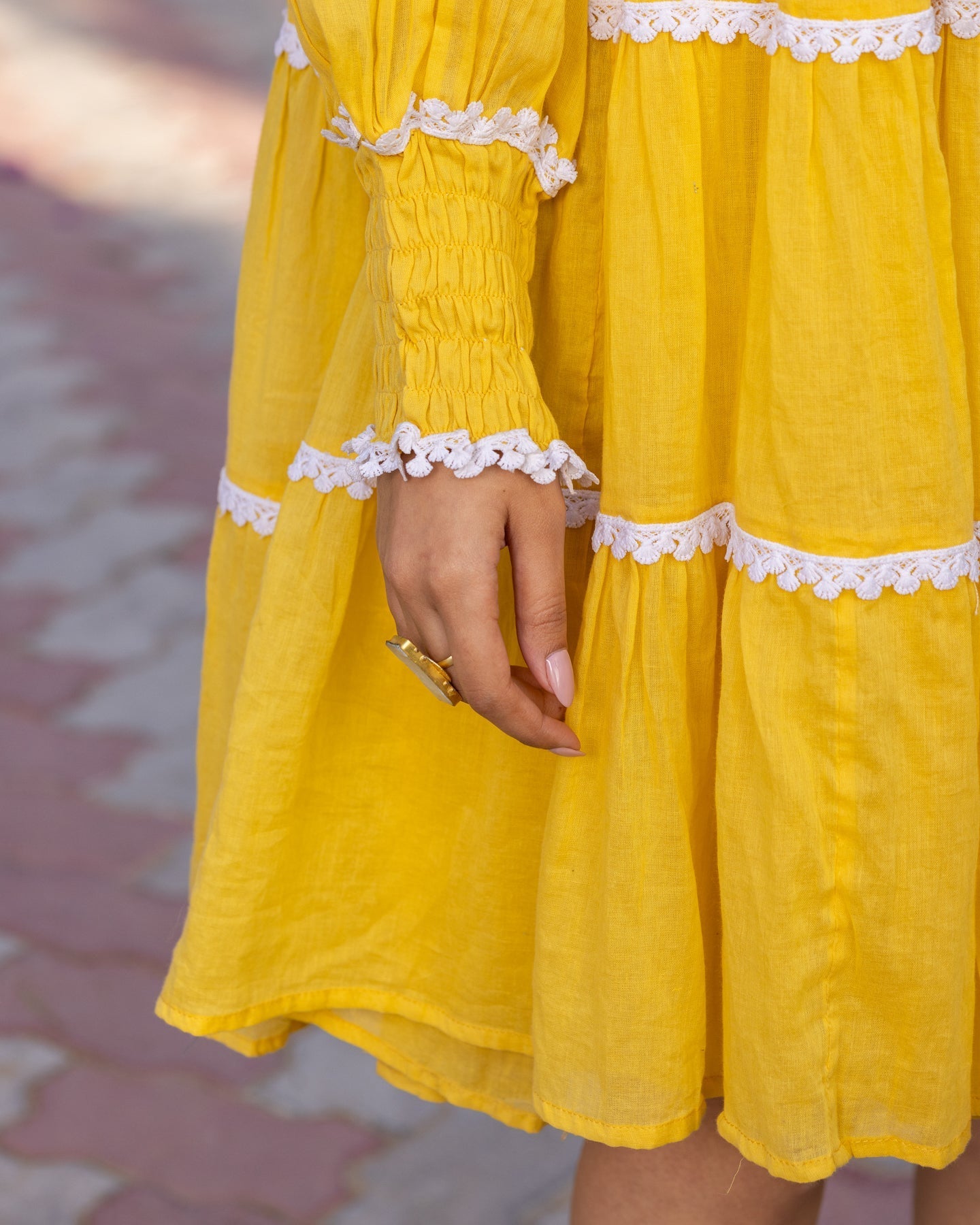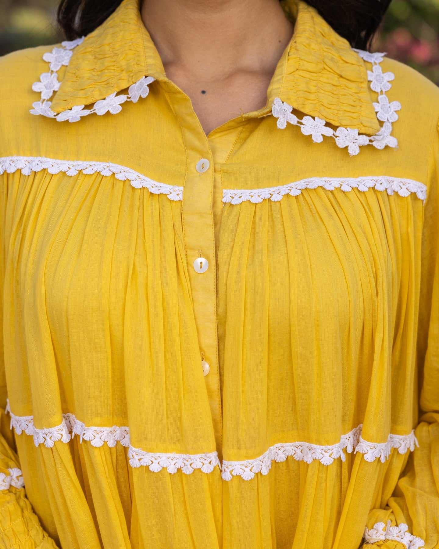 Brighten your wardrobe with this vibrant mulmul Yellow Lace & Tiered Shirt Dress, featuring delicate lace details on a tiered silhouette for a playful yet elegant look. Perfect for sunny days and balmy evenings, it combines comfort with chic style for any occasion.